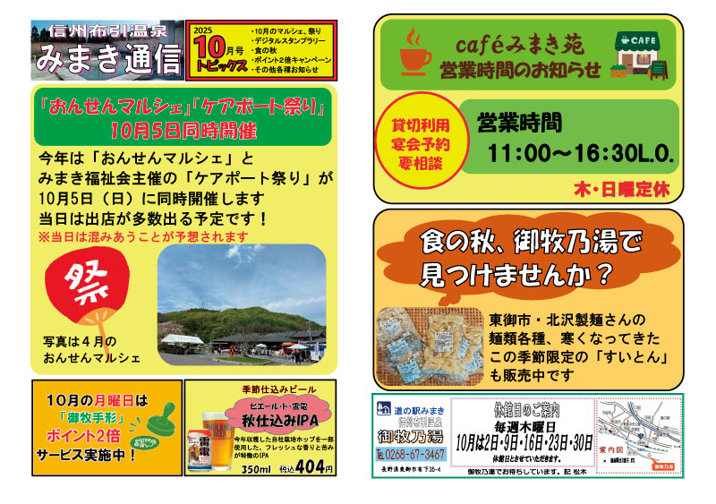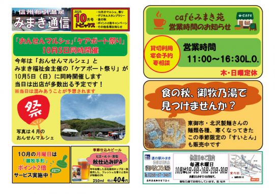 東御市布下にある温泉施設、信州布引温泉御牧乃湯から2025年10月のお知らせです。