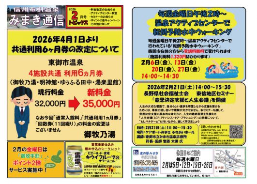 東御市布下にある温泉施設、信州布引温泉御牧乃湯から2026年2月のお知らせです。