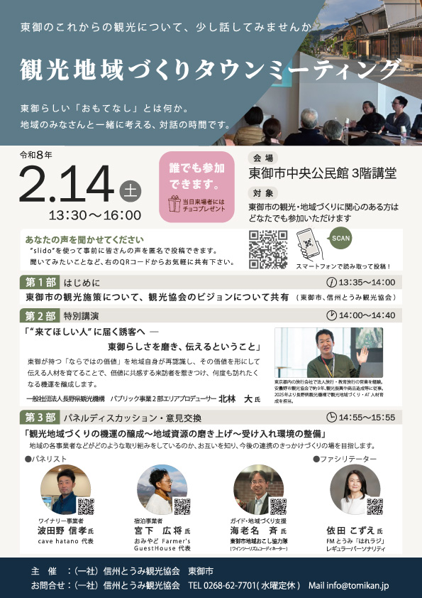 参 加:申込み不要。東御市の観光・地域づくりに関心のある方はどなたでも参加できます!