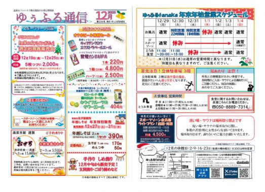 田中駅前にある温泉施設、ゆぅふるtanakaから2025年12月のお知らせです。