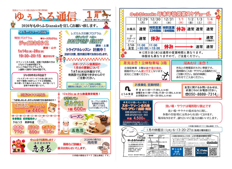田中駅前にある温泉施設、ゆぅふるtanakaから2026年1月のお知らせです。