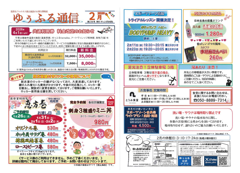 田中駅前にある温泉施設、ゆぅふるtanakaから2026年2月のお知らせです。