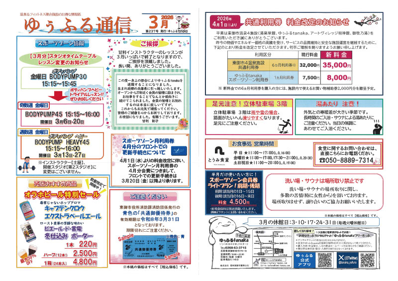 田中駅前にある温泉施設、ゆぅふるtanakaから2026年3月のお知らせです。