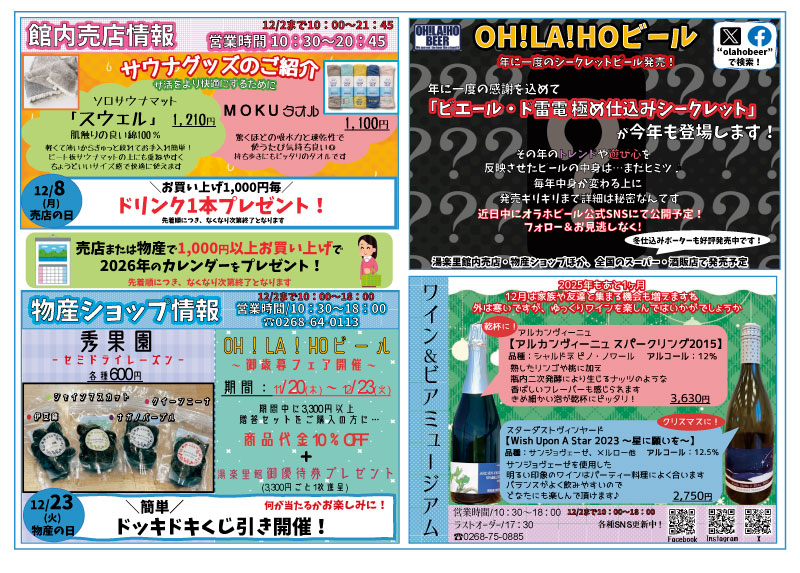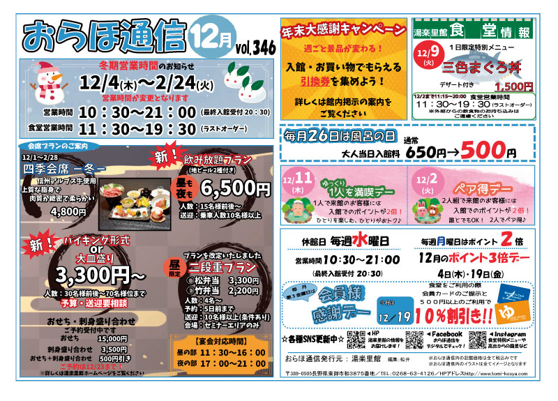 東御市和にある温泉施設、湯楽里館から2025年12月のお知らせです。