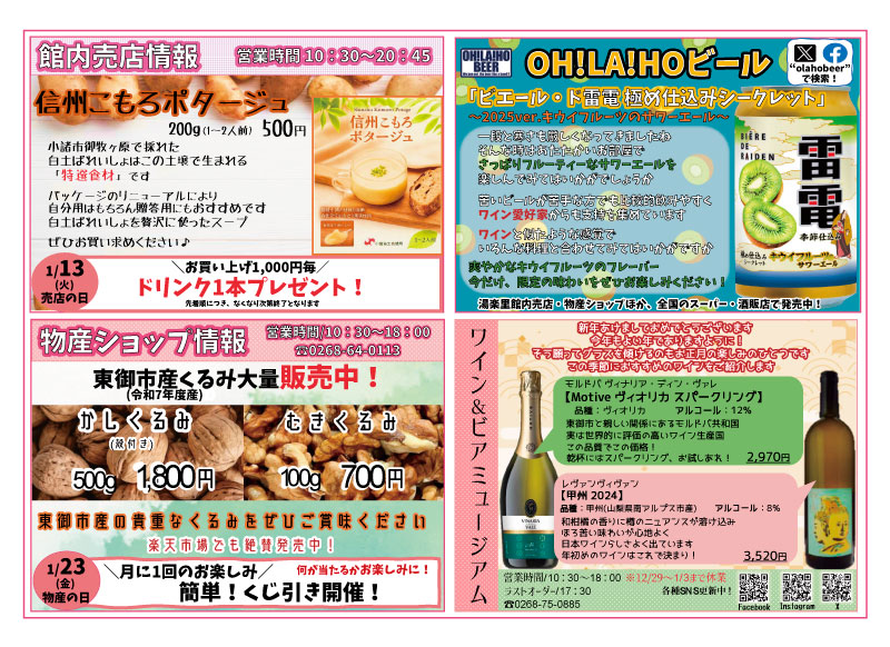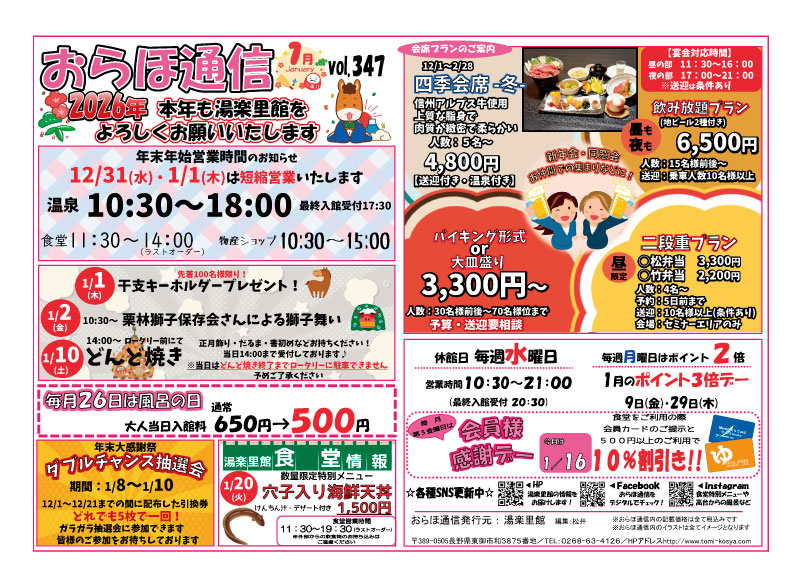 東御市和にある温泉施設、湯楽里館から2026年1月のお知らせです。
